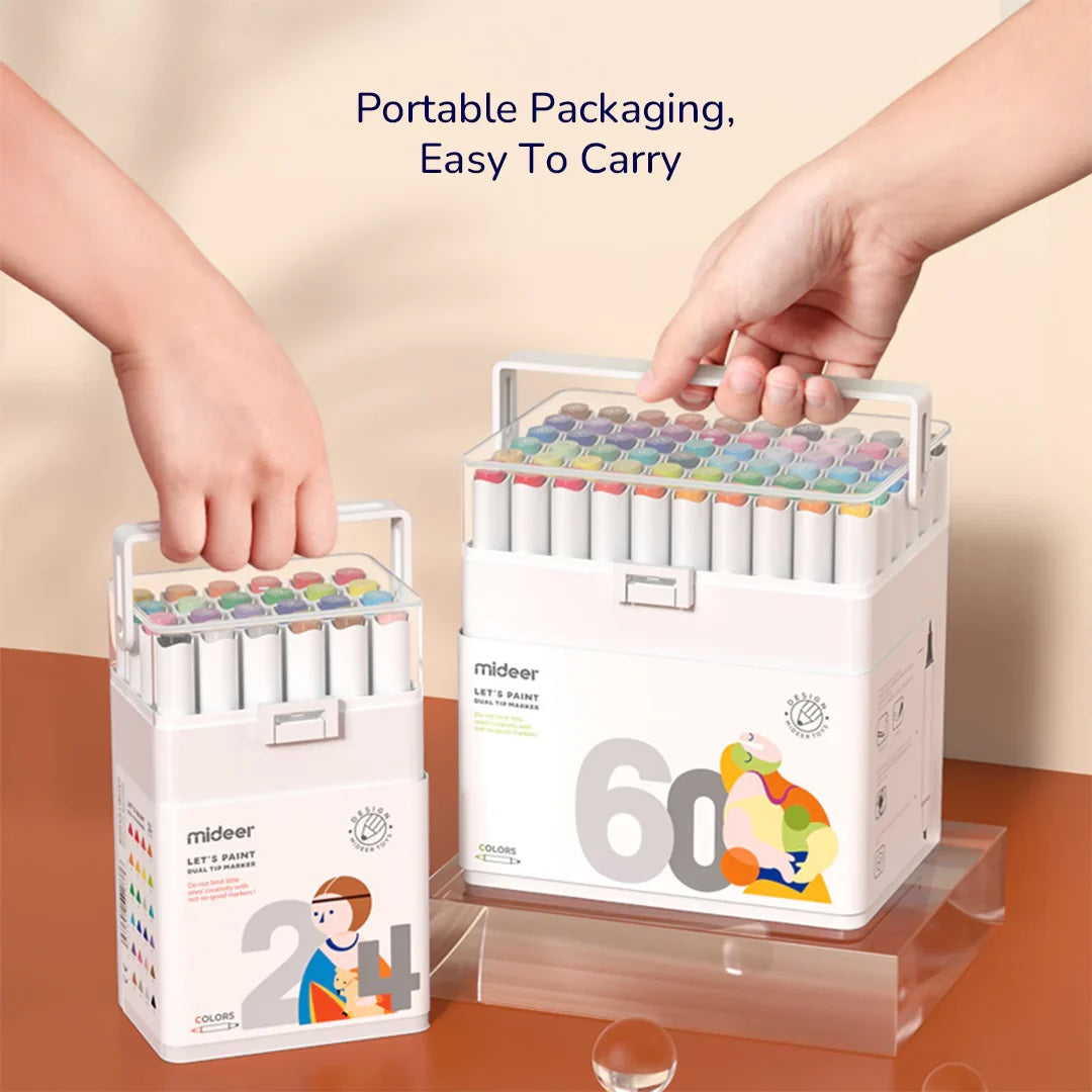 Let’s Paint! The Mideer Water-based Dual Tip Marker Series is designed to inspire creativity in young artists. Available in sets of 24, 36, or 48 vibrant colours, each marker features a dual-tip design—fine for detailing and broad for colouring—making it perfect for various drawing needs. The high-density fiber tips ensure smooth ink flow, while the water-based formula is both non-toxic and washable, offering a safe and clean creative experience for children.